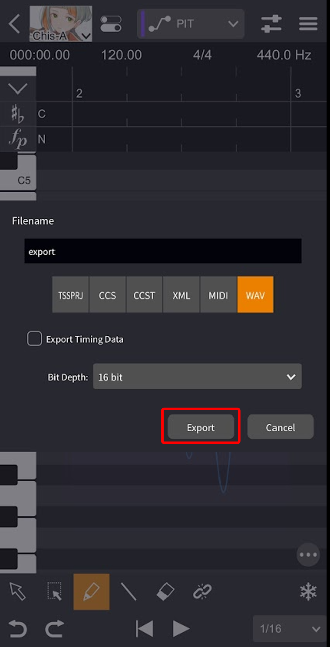 - Specify the file name, file format, etc. in the settings screen, then tap "Export". It will be saved in "On My iPhone (or iPad)" > "VoiSona" > "Export" folder.