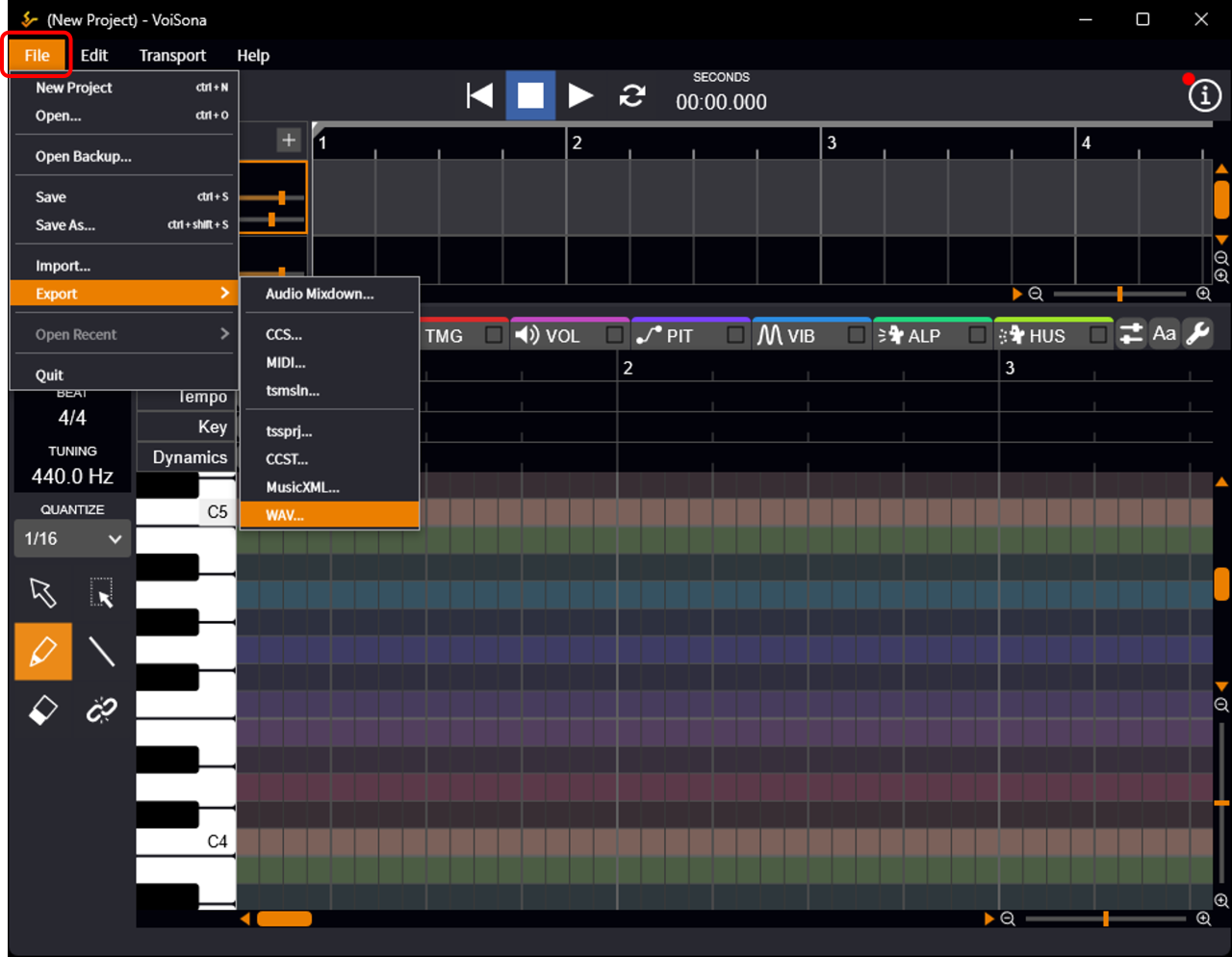 - WAV Rendered vocal audio. Exports the selected track. Enable "Export Timing Data" to also output a Lab file.