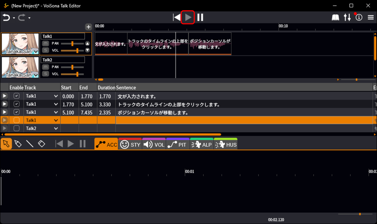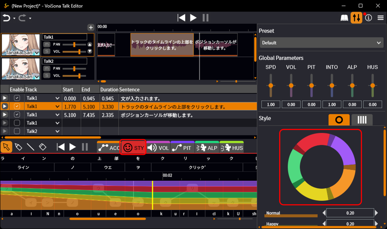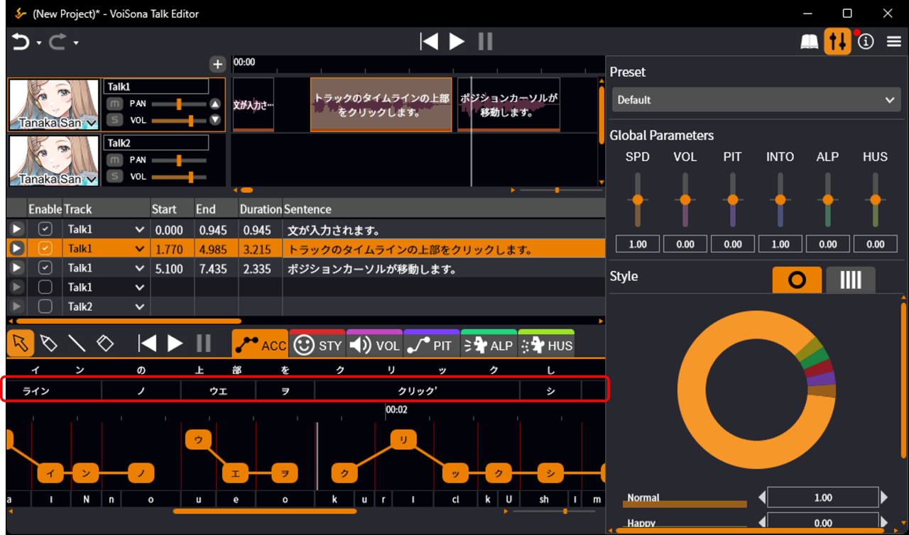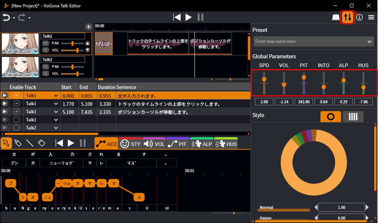 - Drag the sliders for "SPD", "VOL", "PIT", "INTO", "ALP", and "HUS". These parameters will be applied to the entire sentence.