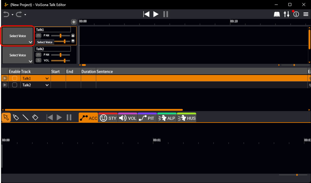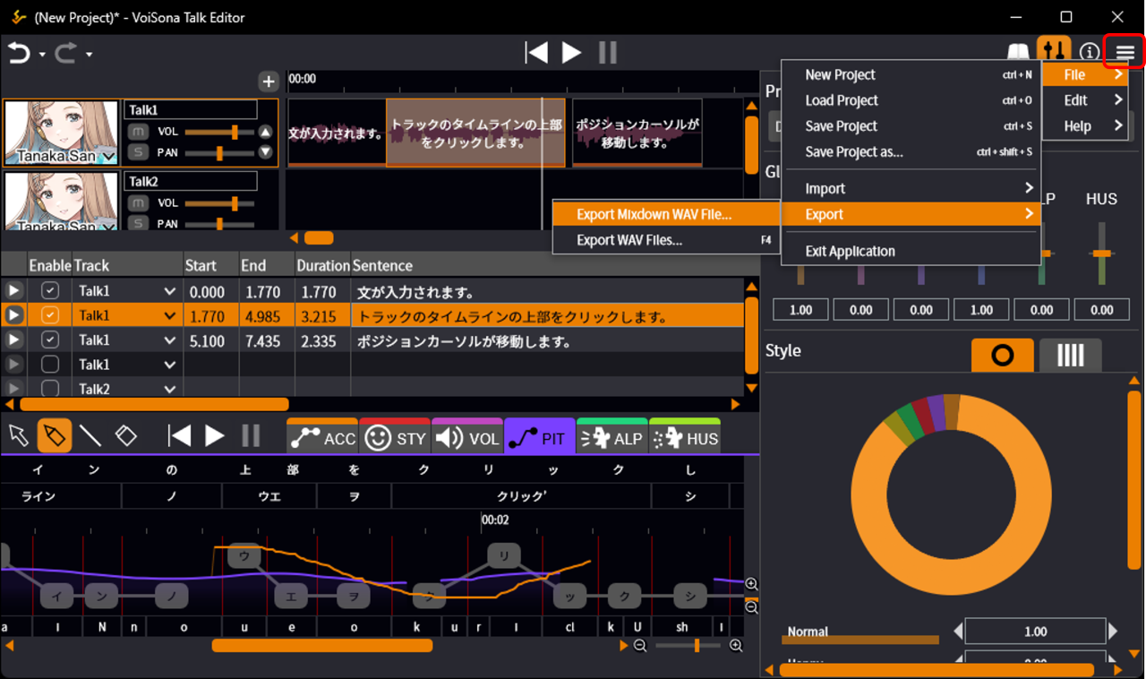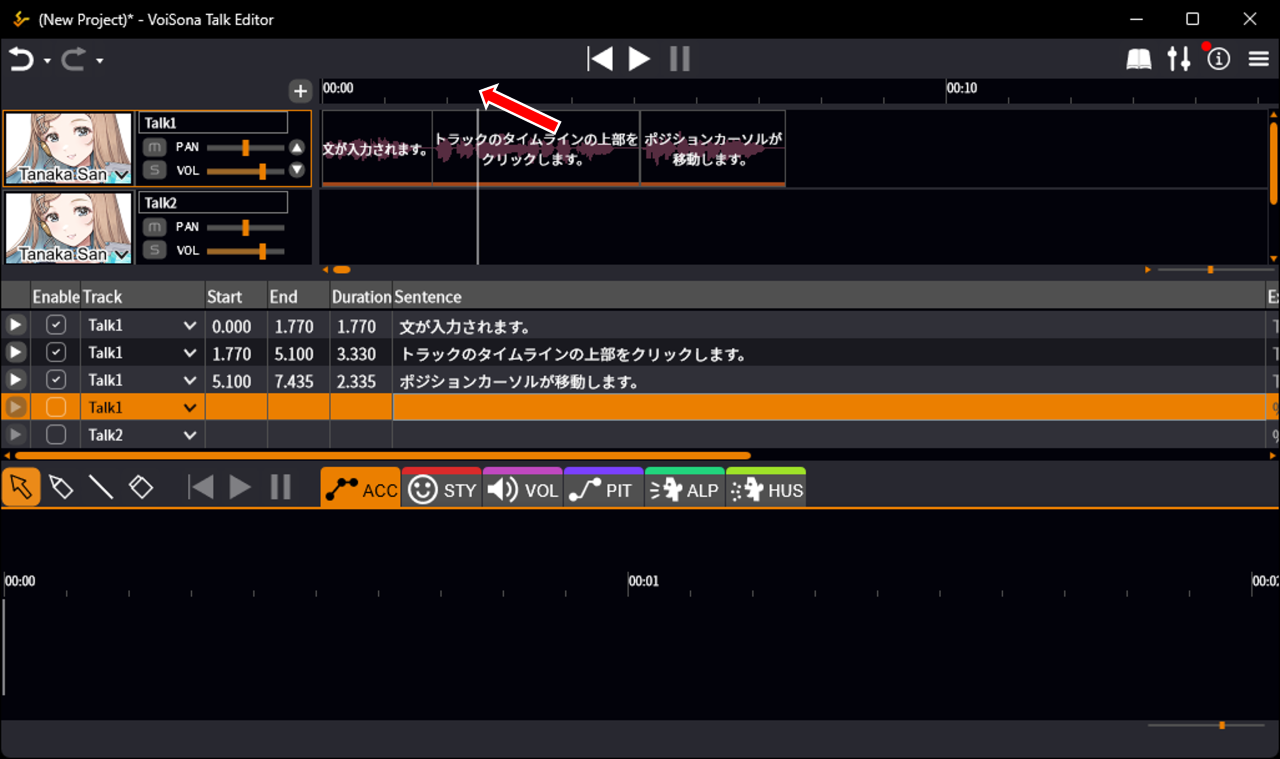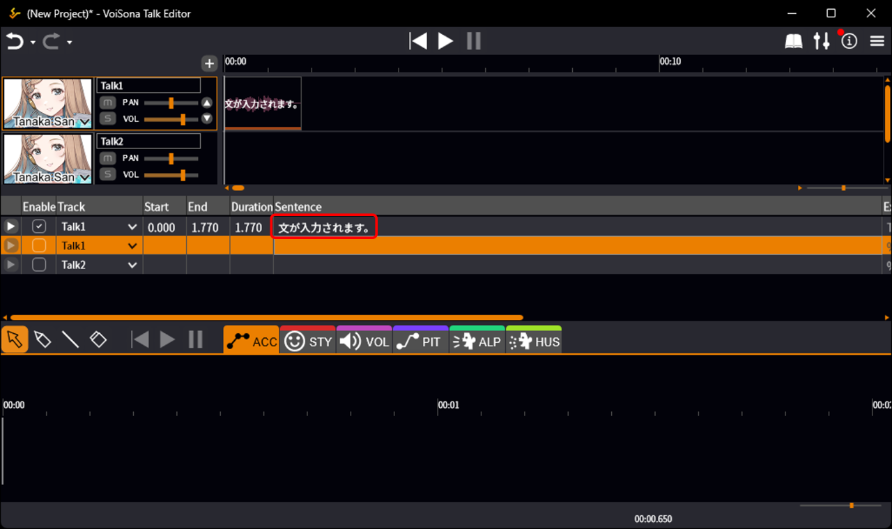 - Drag the sliders for "SPD", "VOL", "PIT", "INTO", "ALP", and "HUS". These parameters will be applied to the entire sentence.