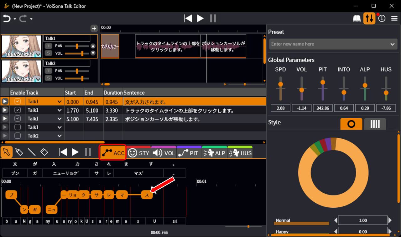 - Click on the mora in the "ACC" adjustment screen. The accent position will be changed.
