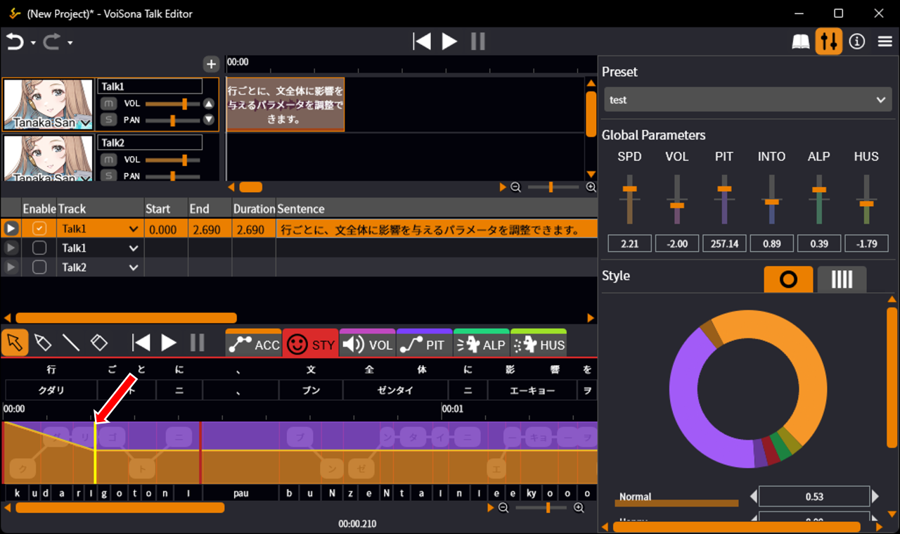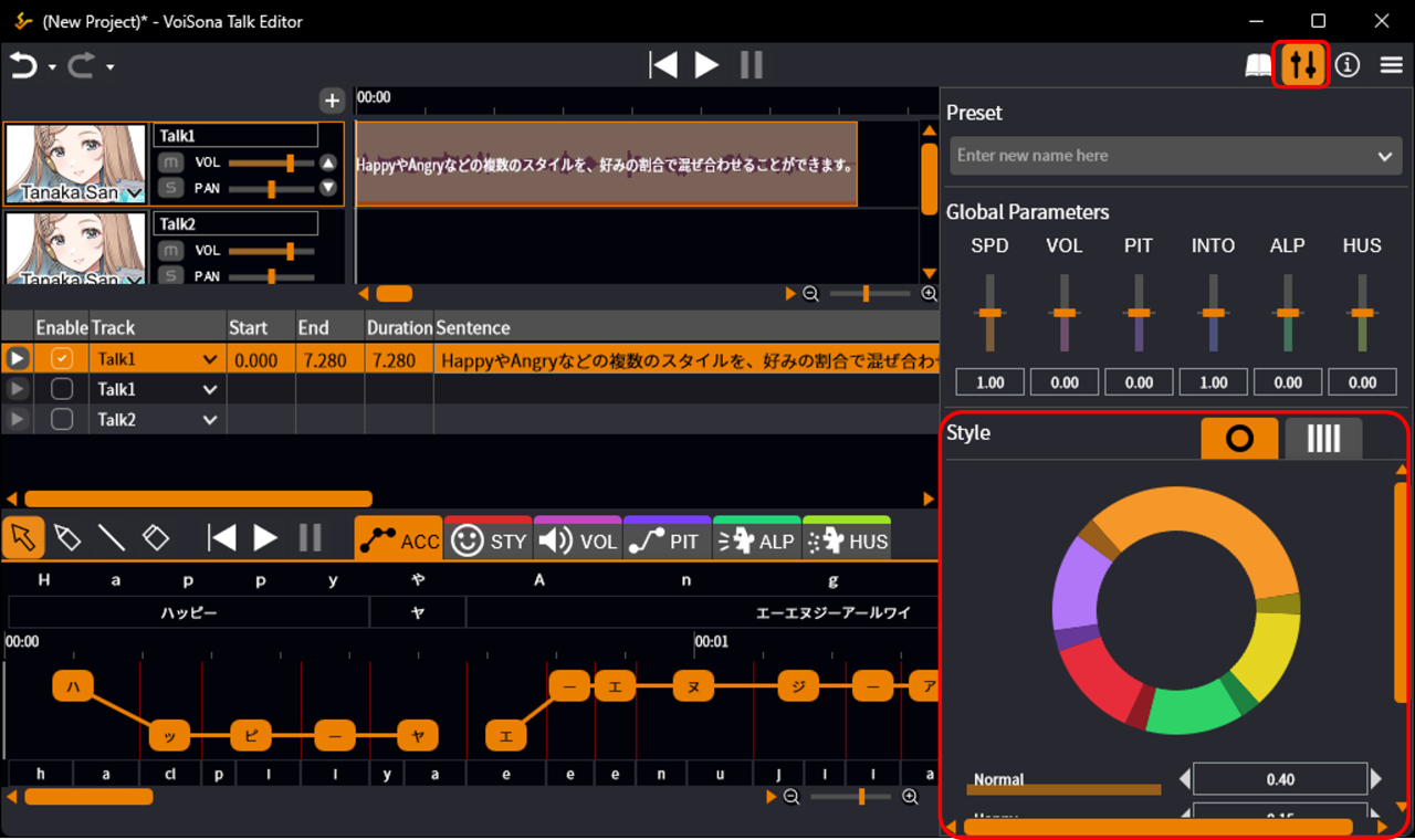 Adjusting Global ParametersAdjusting Sentence StyleSaving Parameter Settings (Presets)Adjusting Advanced ParametersAdjusting AccentSplitting and Merging Accent PhrasesAdjusting Style at Specified PositionsCopying StylesAdjusting Other ParametersSelecting and Manipulating Ranges