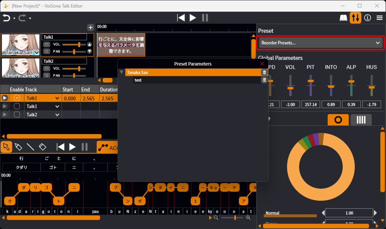VoiSona Talk supports a wide range of adjustments, from parameters that affect the entire sentence to detailed settings such as speaking style and accent.