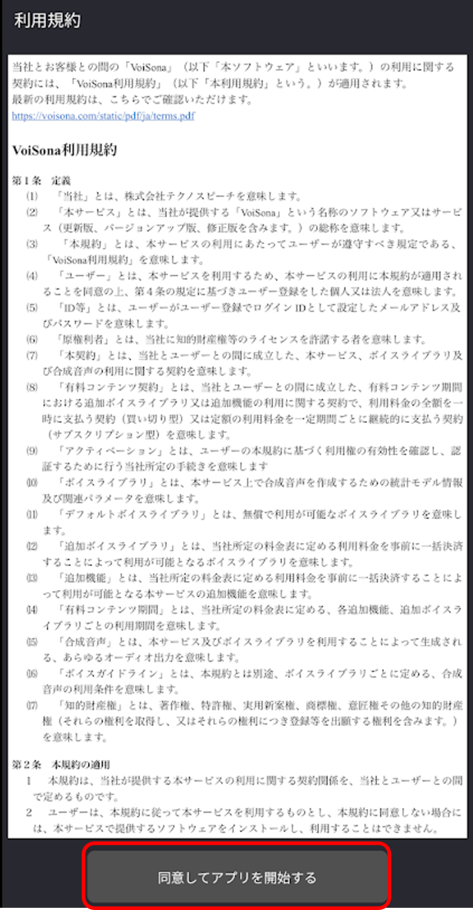 - 利用規約に同意する場合は、「同意してアプリを開始する」をタップします。