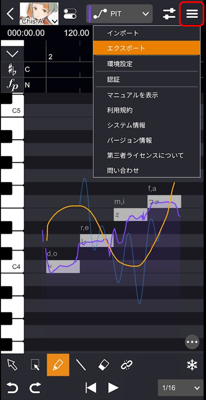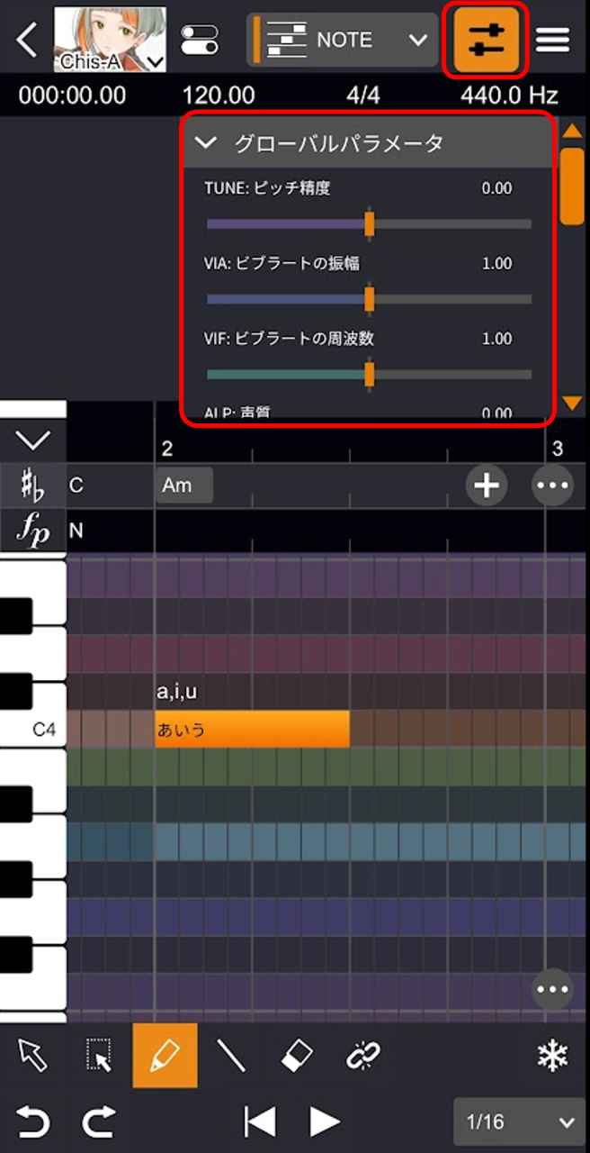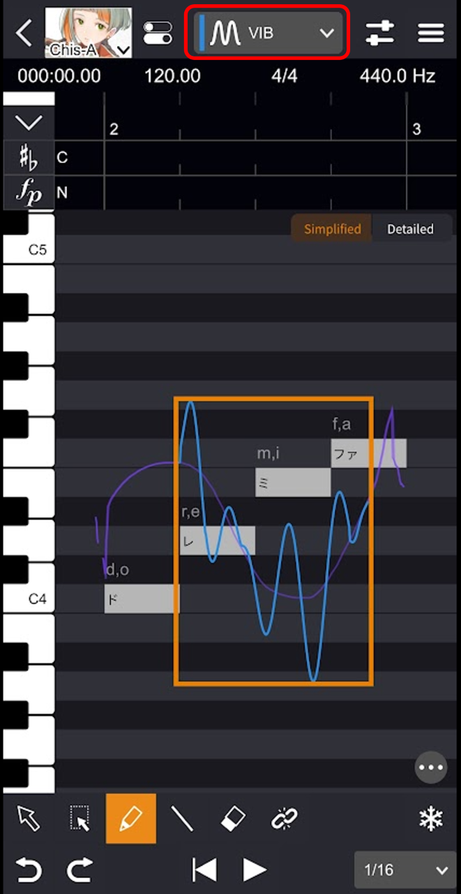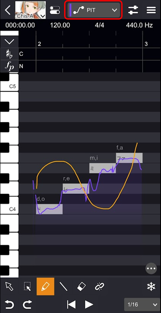 - プルダウンから「VOL」「PIT」「ALP」「HUS」のいずれかを選択し、編集画面をタップします。