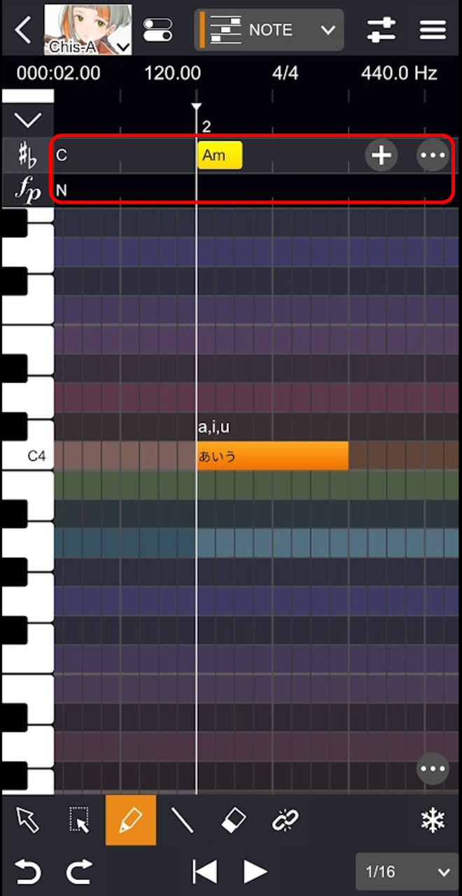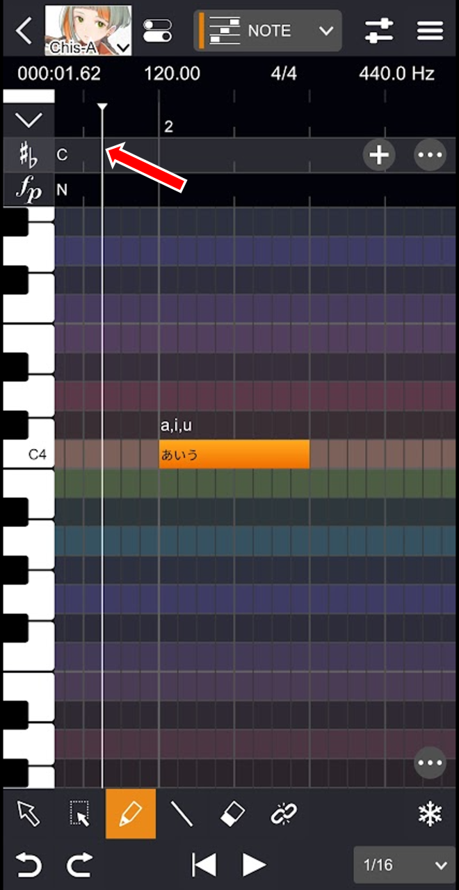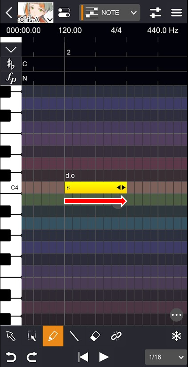 - ピアノロール上部の行をタップします。