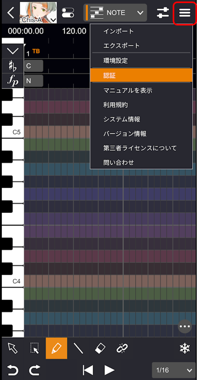 - 「メニュー」ボタンをタップし「認証」を選択します。