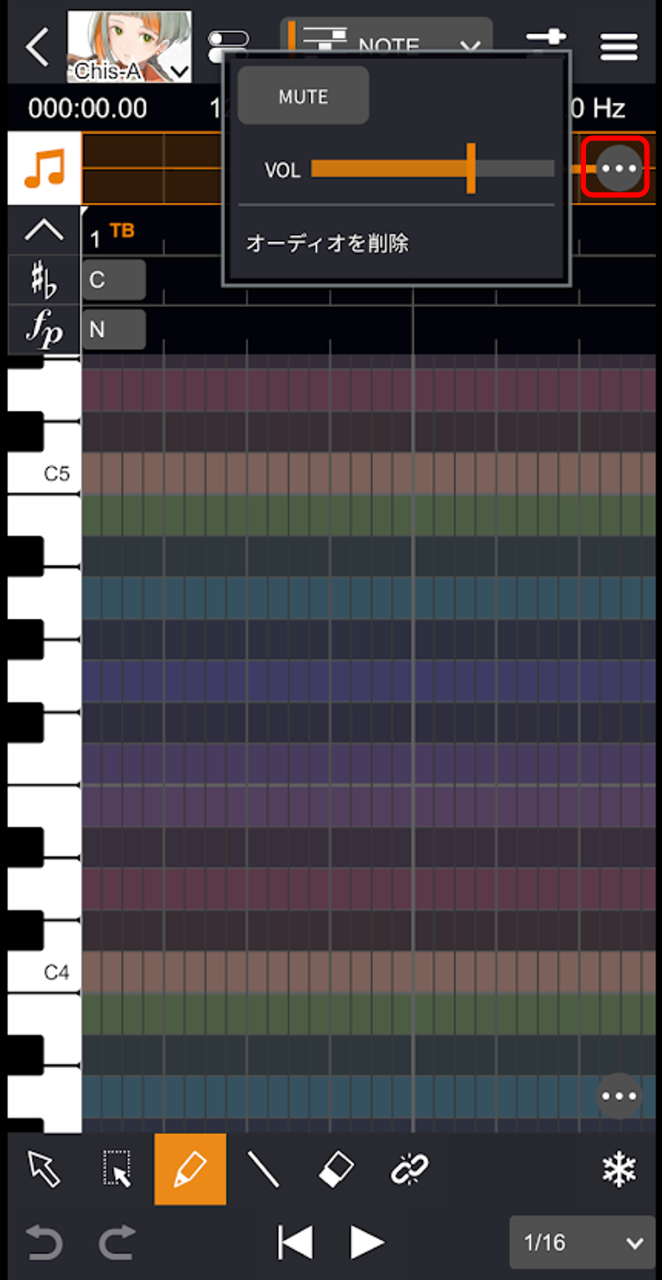 「コンテキストメニュー」ボタンをタップすると、ミュートの切り替え、音量の調整、オーディオの削除が行えます。