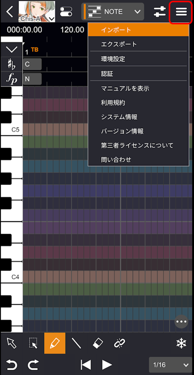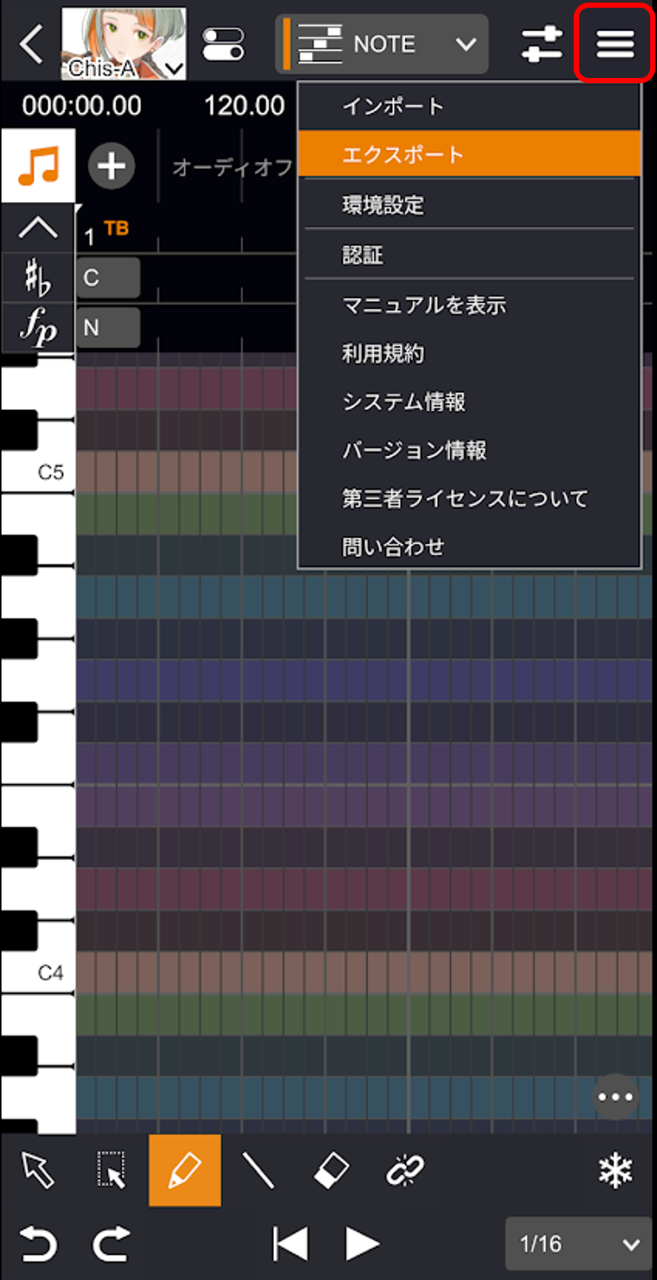 VoiSonaや他のアプリで作成したファイルを読み込んだり、編集中のデータを書き出したりできます。