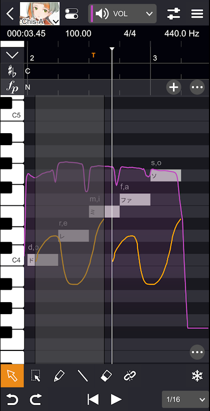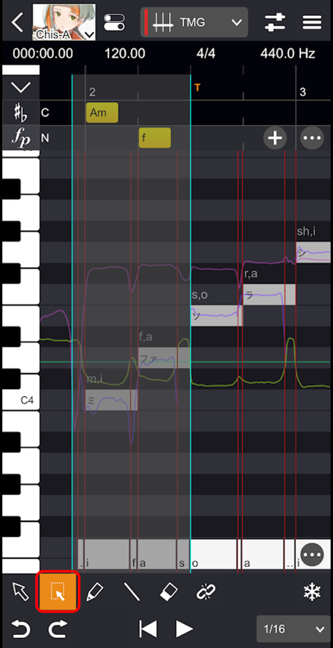 「まとめ選択ツール」を使うと、音符とパラメータをまとめて選択できます。