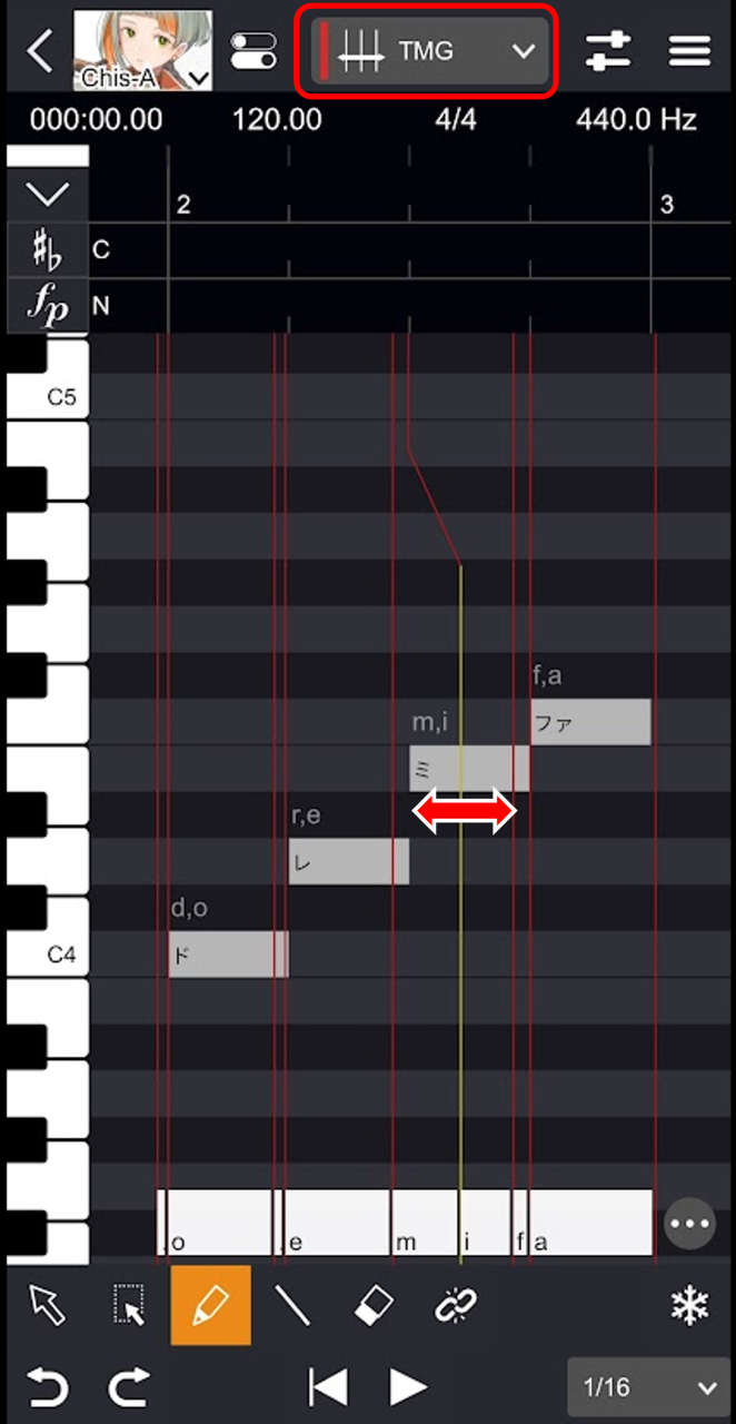 これにより、母音が音符の先頭に来るようにラインが自動で調整されます。