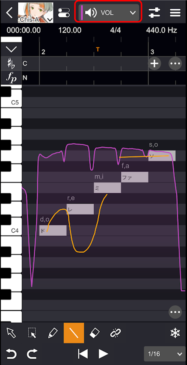 - ビブラートの区間を編集します。 デフォルトではSimplifiedモードになっており、次のように操作できます。