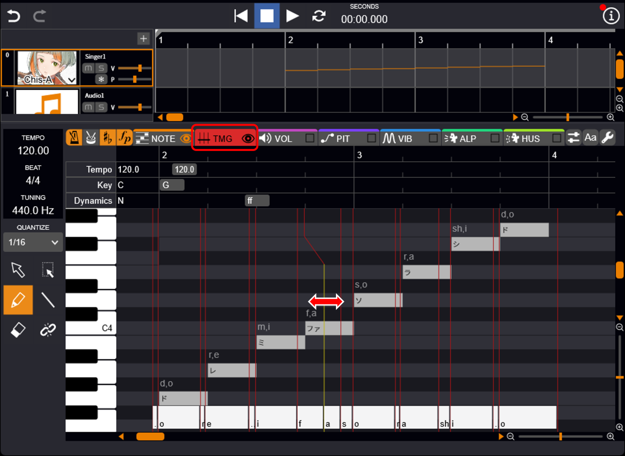 - 赤色の線を左右にドラッグします。 音素の始まりと終わりのタイミングが調整されます。