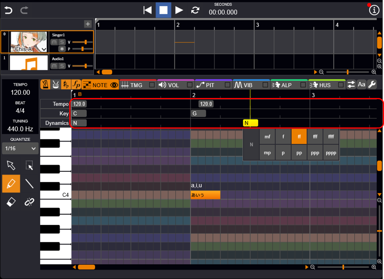 - ピアノロール上部の行をダブルクリックし、設定したい項目を選択します。 ダブルクリックした行に対応する記号が設定されます。