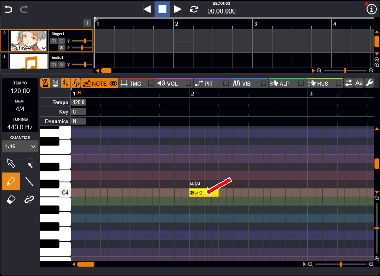 - 音符をダブルクリックし、文字を入力してEnterで確定します。 歌詞が変更されます。