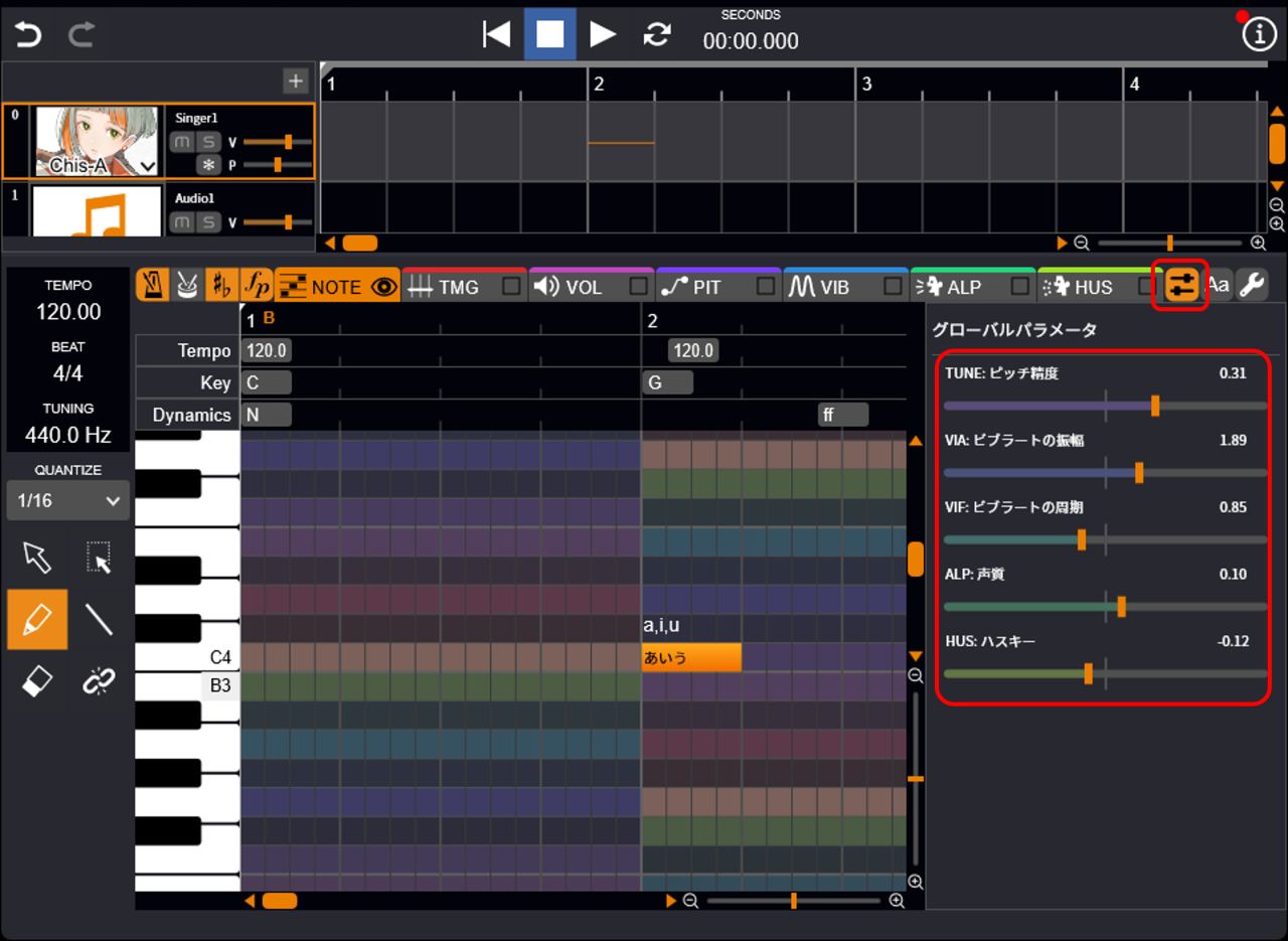 - 「TUNE」「VIA」「VIF」「ALP」「HUS」のスライダーをドラッグして動かします。 曲全体に影響を与えるパラメータが調整されます。