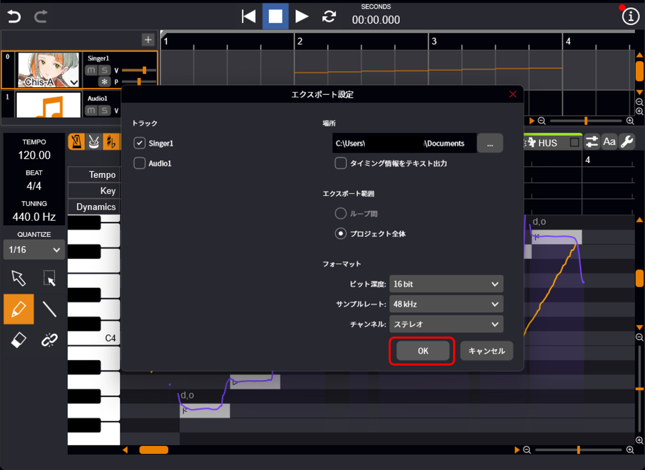 - 設定画面で「OK」をクリックします。 指定した場所にWAVファイルが保存されます。
