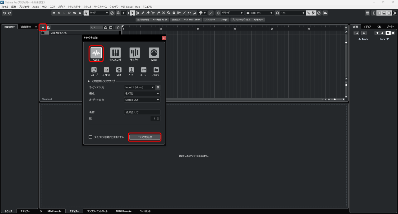 オーディオが設定されていない部分は、音声が出力されないDAWもありますので、ご注意ください。