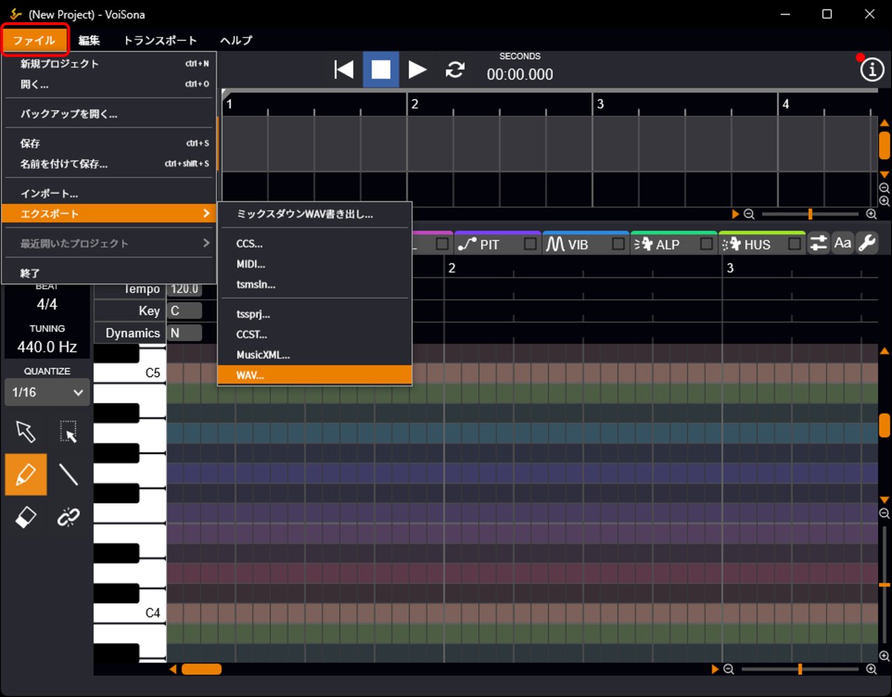 - ミックスダウンWAV書き出し 全トラックを合成して、WAV形式の1つのファイルとして出力します。
