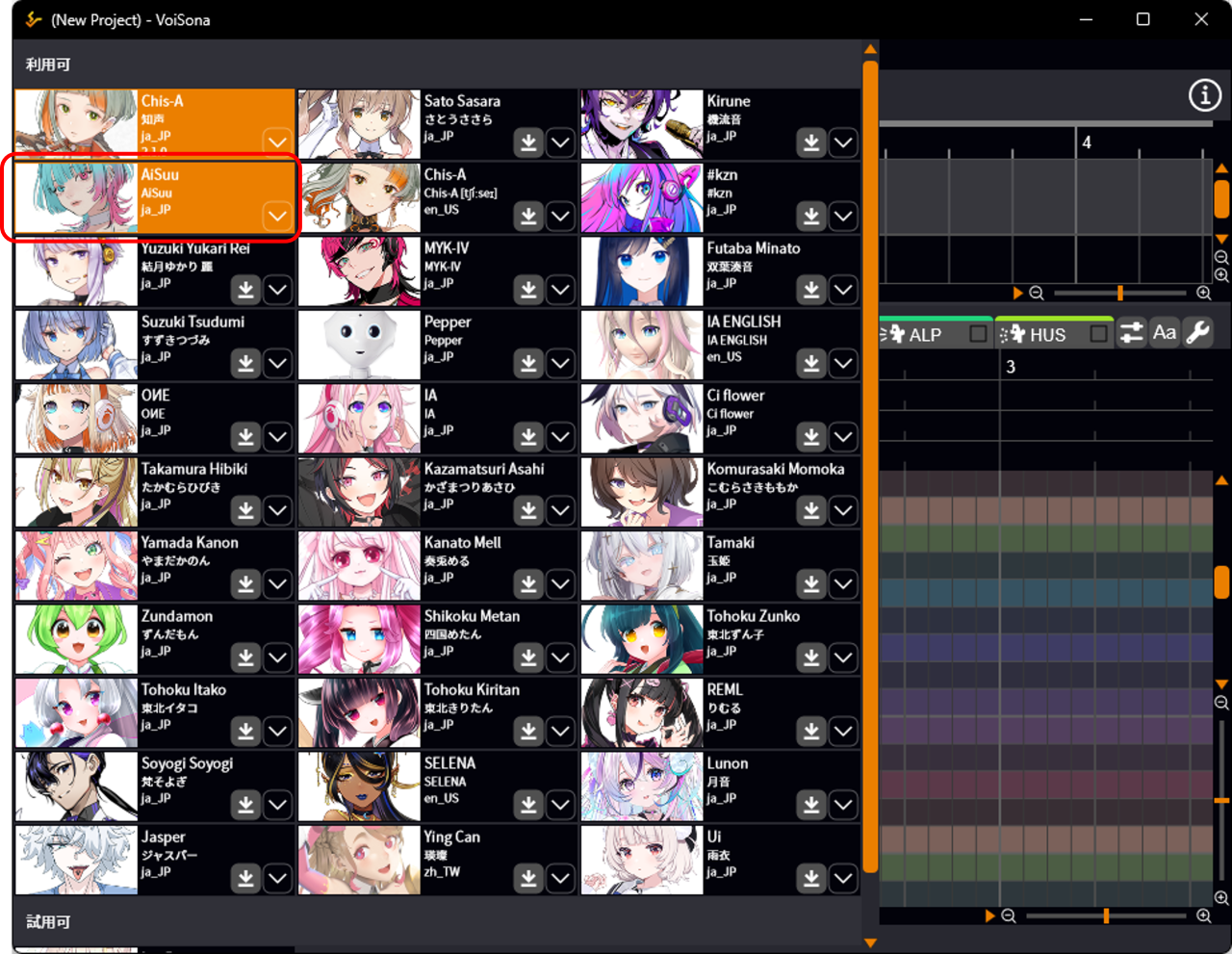 楽曲に使用する歌声を、ボイスライブラリから選ぶことができます。