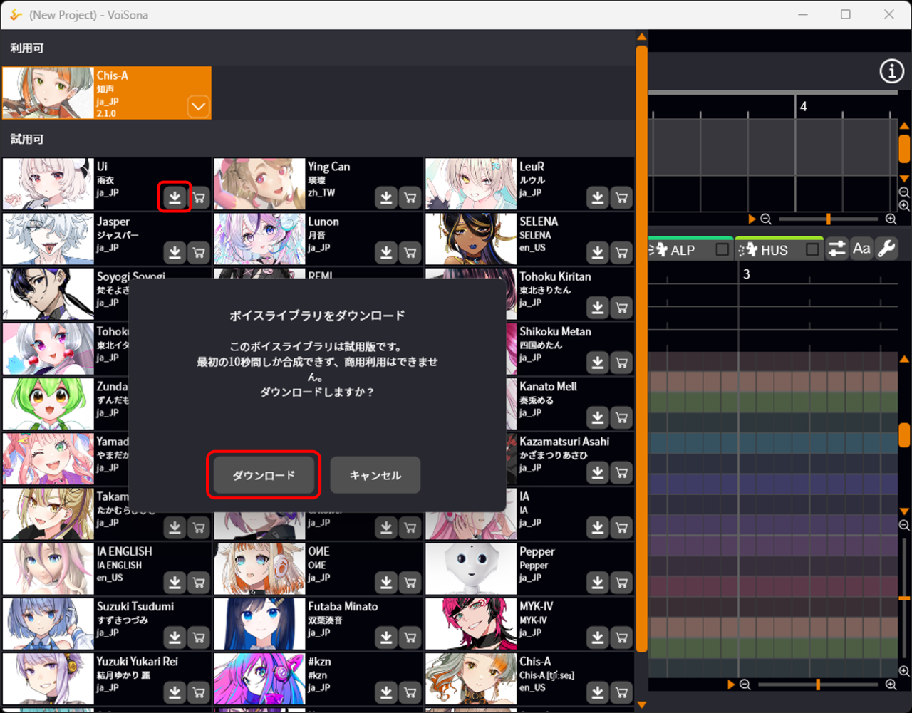 未契約のボイスライブラリも、試用目的で最大10秒間ご利用いただけます。