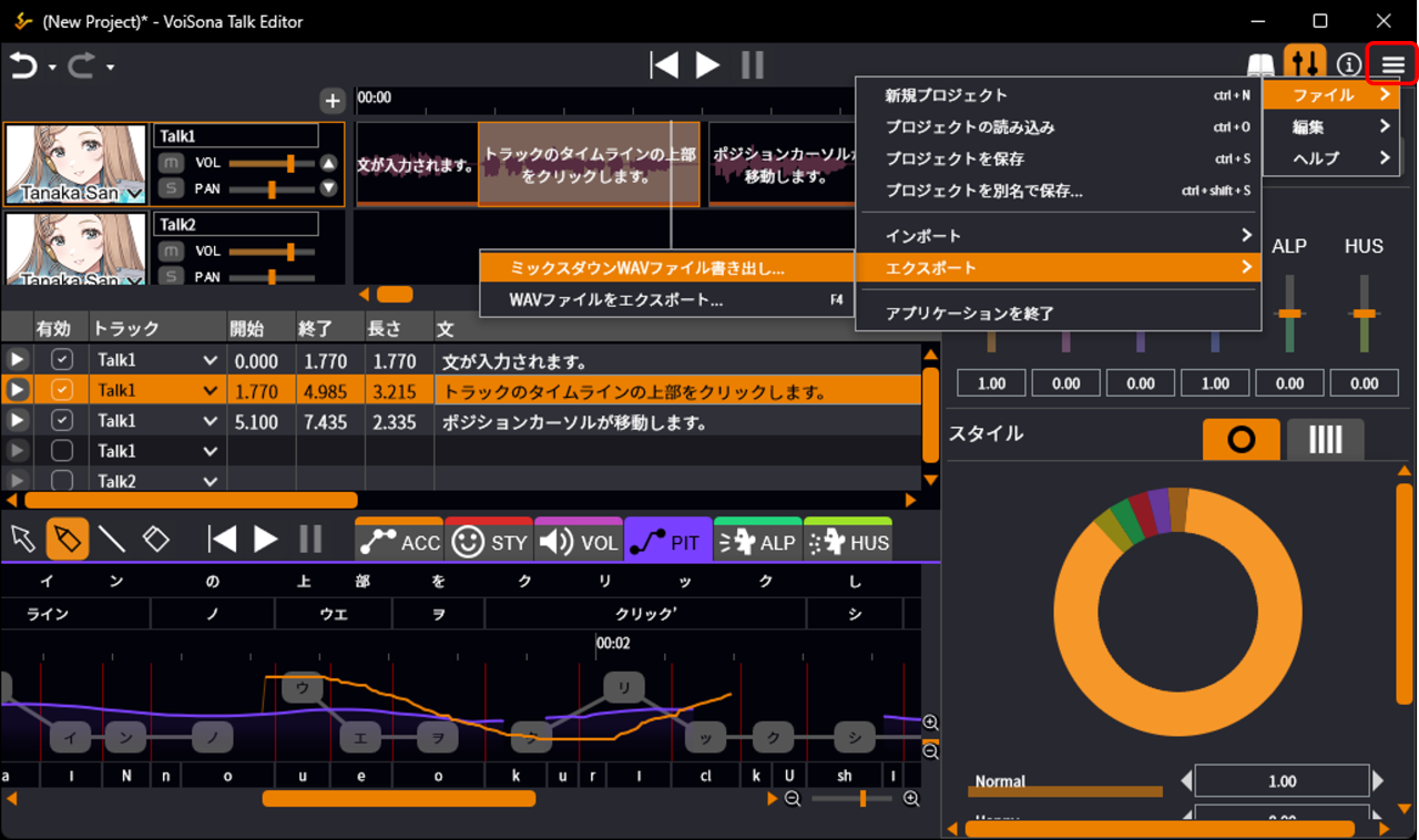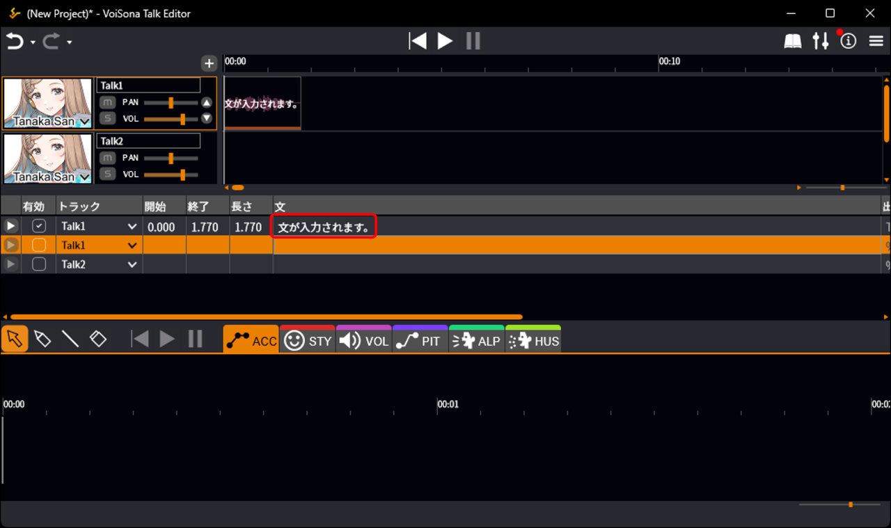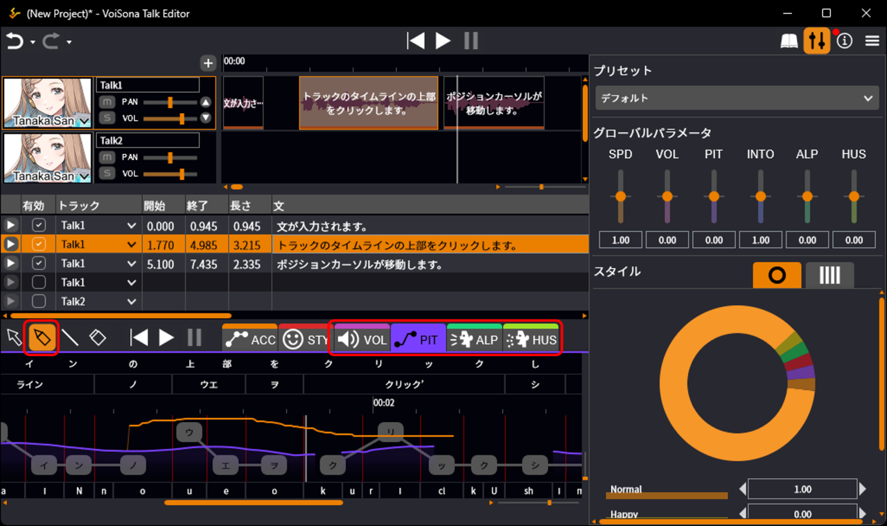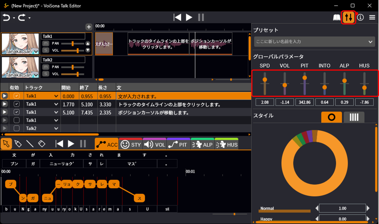 - 「SPD」「VOL」「PIT」「INTO」「ALP」「HUS」のスライダーをドラッグして動かします。 文全体に影響を与えるパラメータが調整されます。