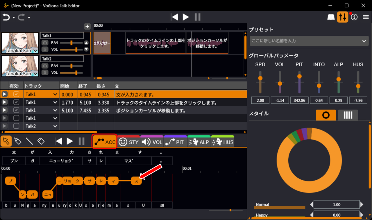 - 「ACC」の調整画面でモーラをクリックします。 アクセントの位置が変更されます。
