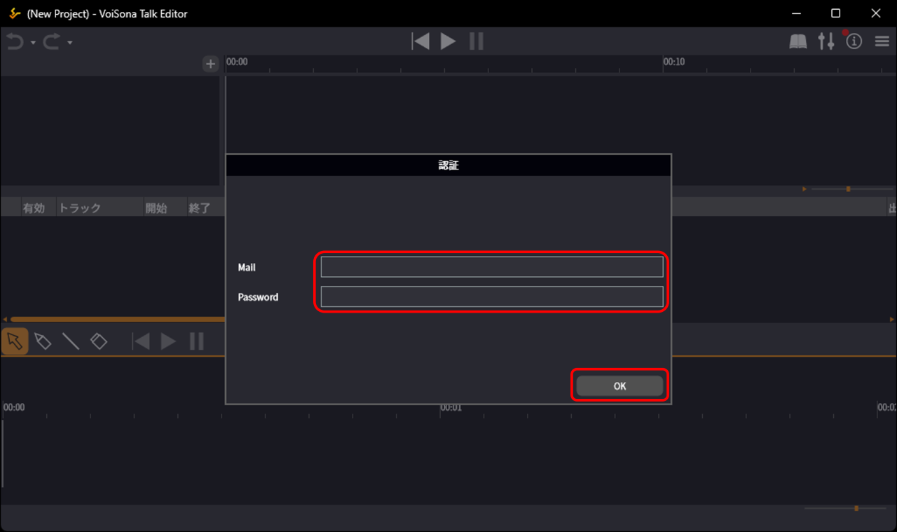 - 登録したメールアドレスとパスワードを入力し「OK」をクリックします。