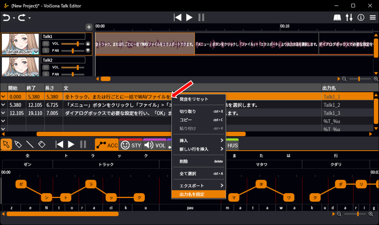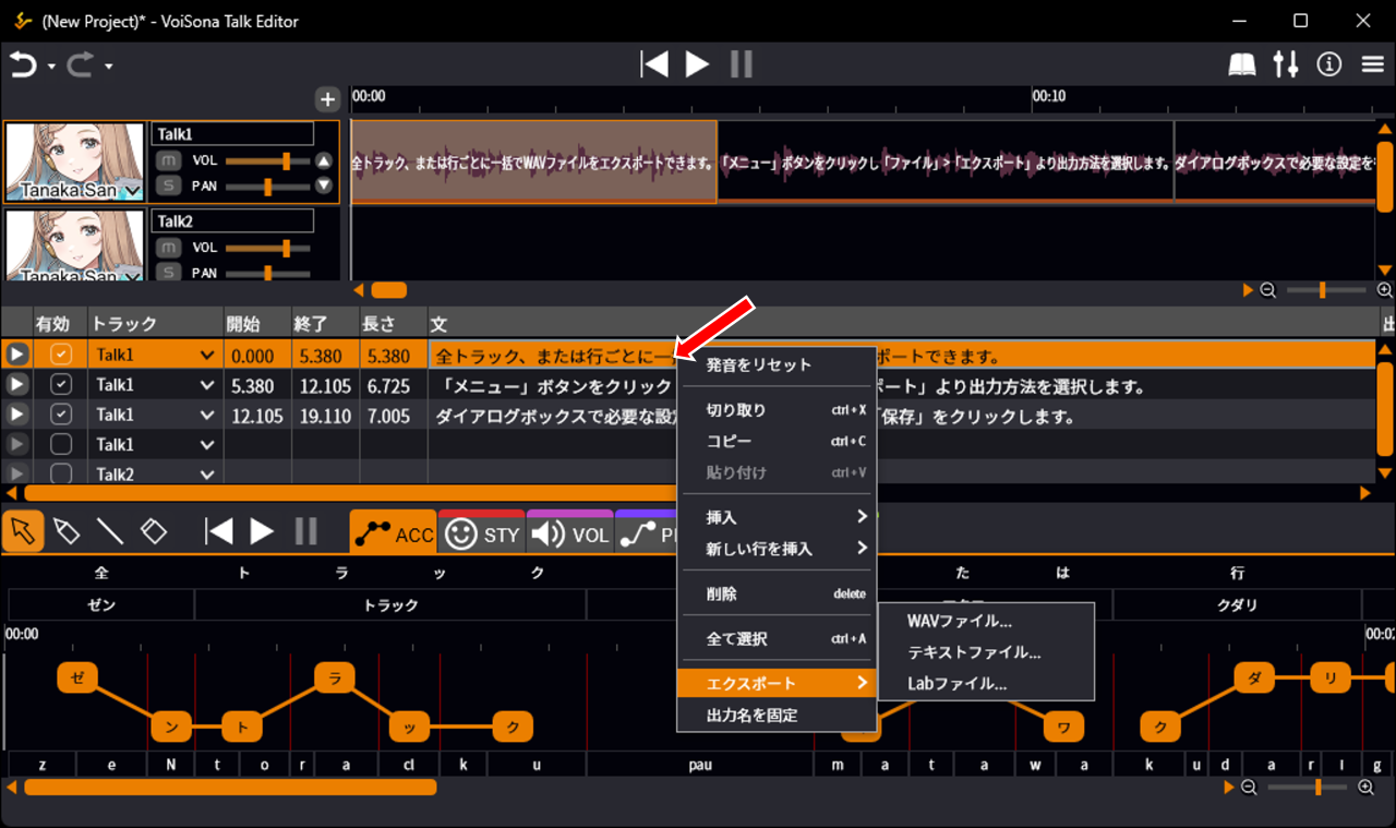 - WAVファイルをエクスポート 行ごとに1つのWAVファイルを出力し、フォルダに保存します。 オプションでテキストファイル、Labファイルを同時に出力できます。