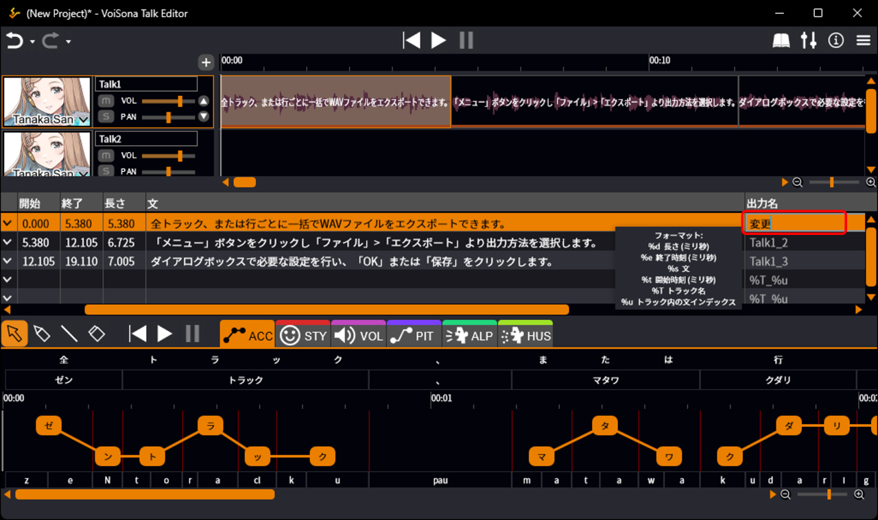 | %t | 合成音声の開始時刻(ミリ秒) | 数値先頭の0埋めもサポート(桁数指定が必要) (例:「%05t」で開始時刻が0.000→00000) |