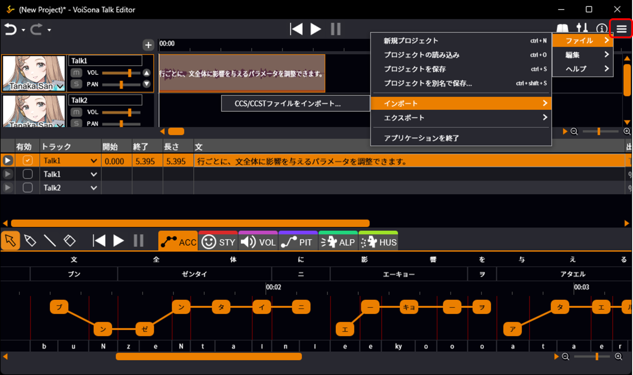VoiSona Talkや他のアプリで作成したファイルを読み込んだり、編集中のデータを書き出したりすることができます。