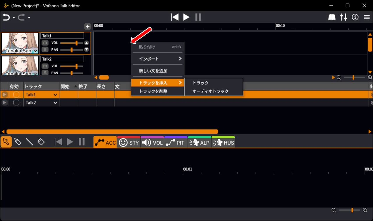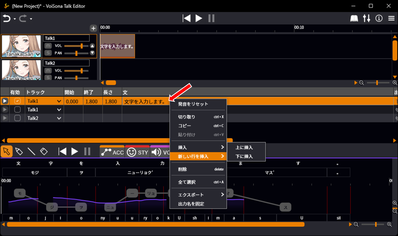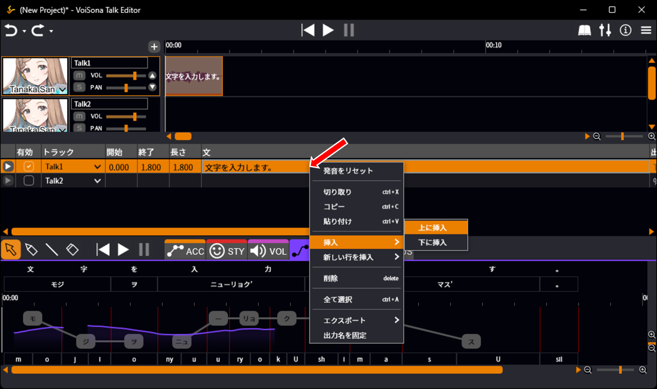 トラックのタイムライン上で右クリックし「新しい文を追加」を選択すると、文リストの該当する箇所に空白の行が追加されます。