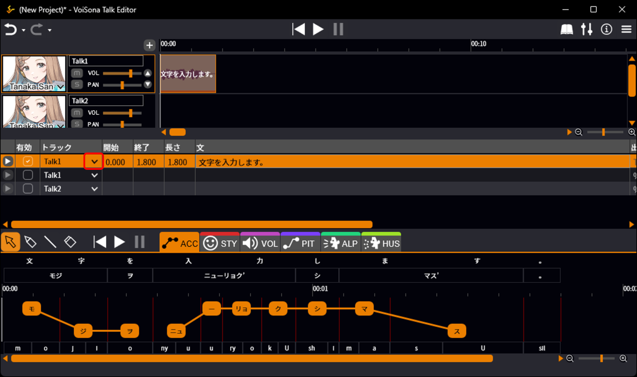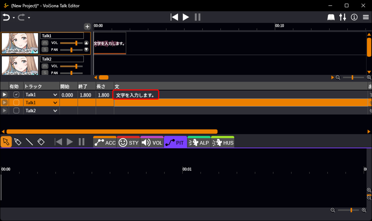 文を入力すると、トラックのタイムライン上にセリフ要素が表示されます。