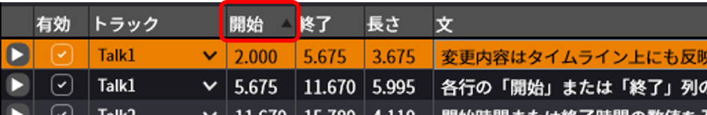 各行の「開始」または「終了」列の項目をクリックし、開始時間または終了時間の数値を指定して文を移動することもできます。