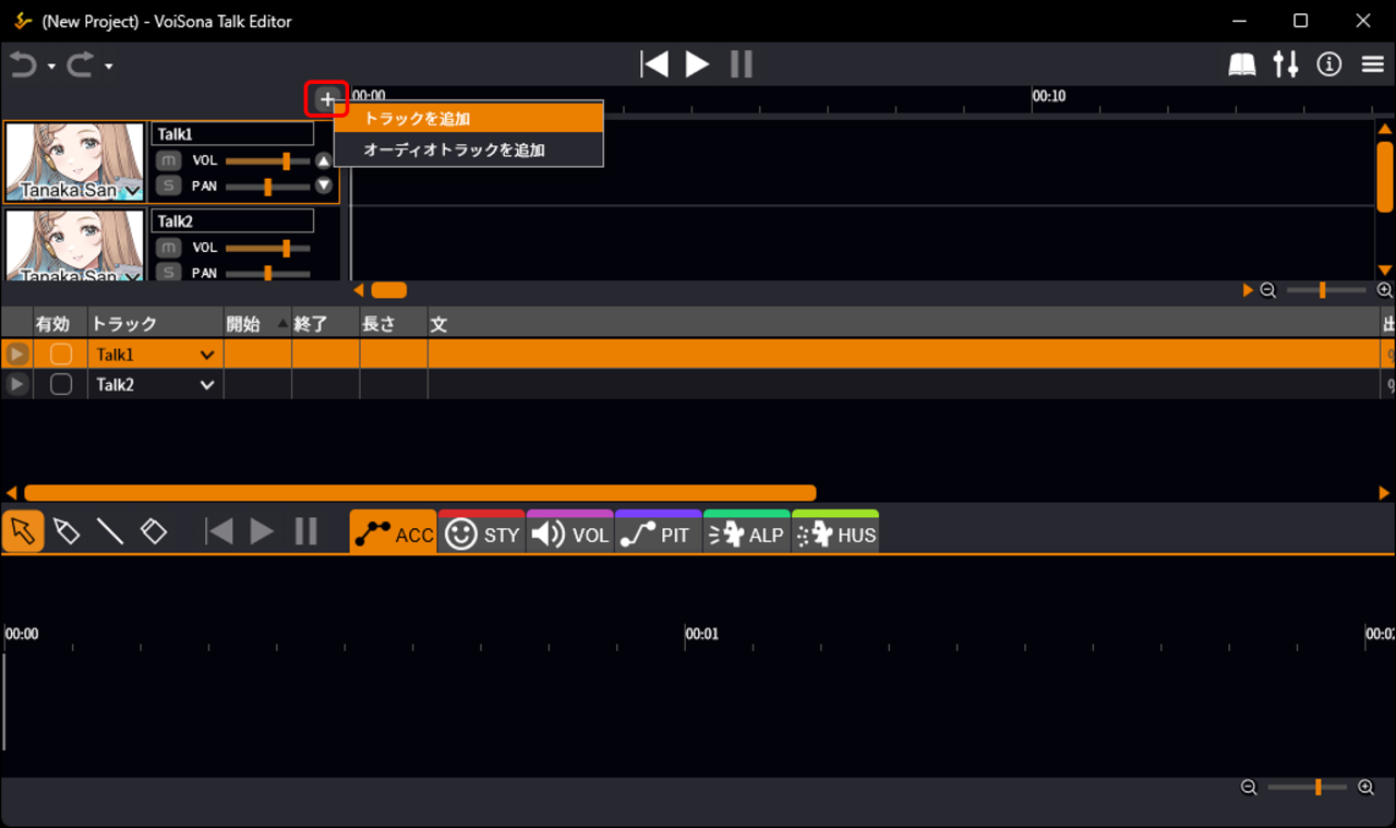 - 「+」>「トラックを追加」または「オーディオトラックを追加」を選択します。 トラックリストの一番下に新規トラックが追加され、文リストに新しい行が追加されます。
