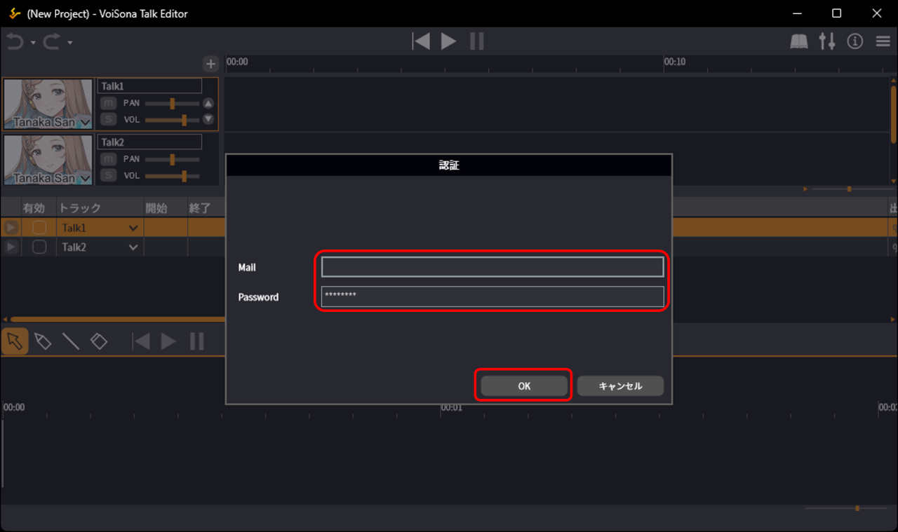 - 登録したメールアドレスとパスワードを入力し、「OK」をクリックします。 認証が成功すると、認証画面が閉じます。